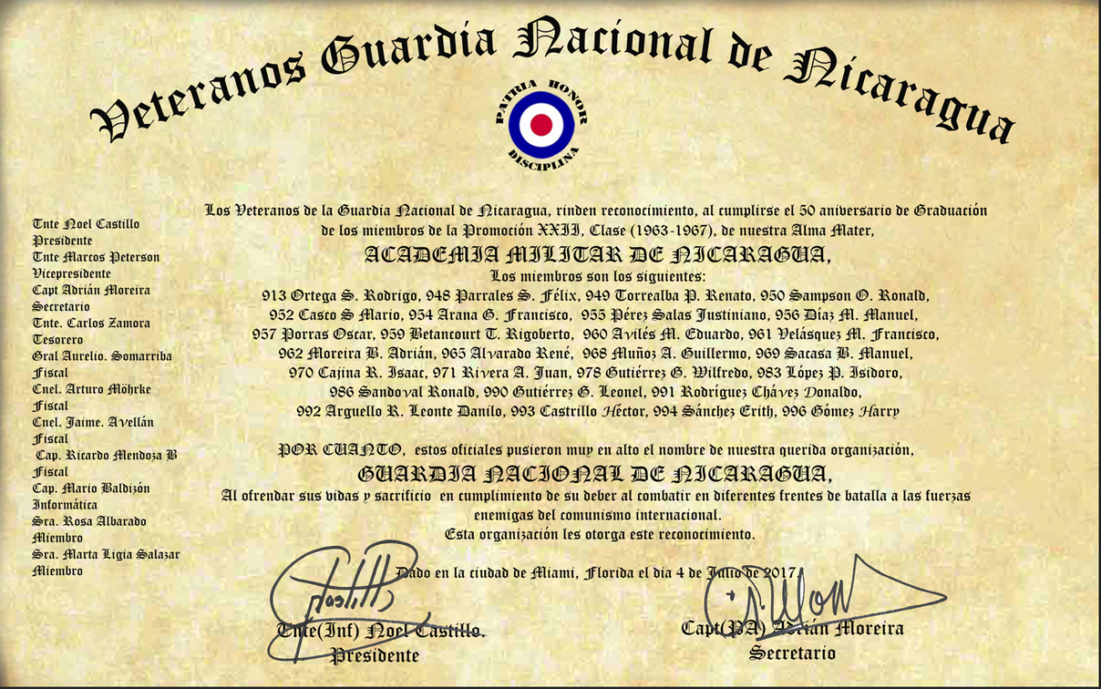 Ultima fila: 983 Isidoro López; 957 Oscar Porras; 995 Francisco Bonilla; 951 Noel Noguera; 970 Isaac Cajina; 991 Donald Rodriguez; 972 René Tejada; 973 Edgard Cajina; 953 Reynaldo Rodriguez Soto; 949 Renato F. Torrealba; 975 William Prado Tuckler; 948 Felix Psarrales; 960 Eduardo Avilés; 985 Mario Guerra; 968 Guillermo Muñoz; 956 Manuel Diaz; 965 René Alvarado.